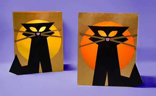 Cut a circle “moon” shape in the front of a paper bag. Glue yellow or orange tissue paper inside the bag to cover the opening. Next, cut out a black cat silhouette from construction paper and glue it in front of the moon. Add eyes, whiskers, and a nose if you’d like. Place a battery tea light inside and watch your cat glow! This craft helps kids practice cutting and layering while creating a cozy Halloween decoration.